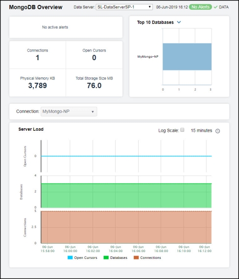 | • | A visual list of the top 10 databases based on average back flush, physical memory, open cursors, storage size, free space, and collections on your connected DataServer. |