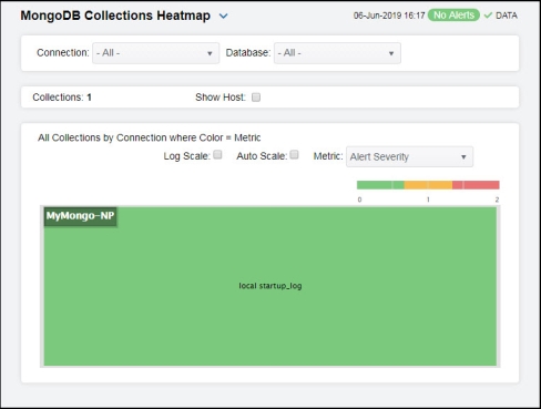 | • | All Collections Heatmap: Opens the MongoDB Collections Heatmap display, which allows you to view performance and utilization metrics for all collections that exist in each of your connections. |