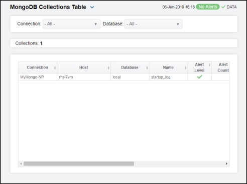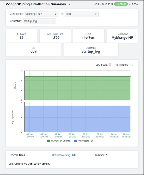 | • | Single Collection Summary: Opens the MongoDB Single Collection Summary display, which shows detailed performance and utilization metrics and trends for a specified collection on a particular database. |