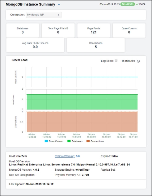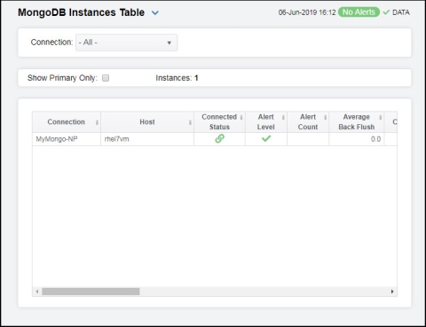 | • | Single Instance Summary: Opens the MongoDB Instance Summary display, which enables you to view available utilization metrics for a single MongoDB instance. |