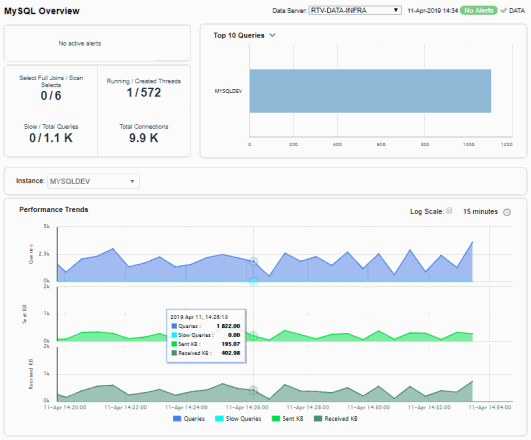 The MySQL Overview is the top-level display for the MySQL Solution Package, which provides a good starting point for immediately getting the status of all your MySQL instances on your Data Server.