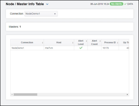 These displays provide detailed data for all node instances or for a particular node instance. Clicking Node/Master from the left/navigation menu opens the Node/Master Info Table display, which shows a tabular view of your connected and recently expired node instances and their associated metrics. The following display is available: