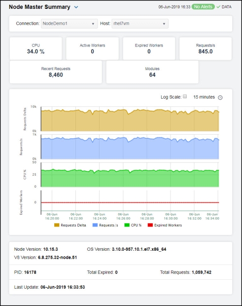 Clicking Single Node Server in the left/navigation menu opens the Node Master Summary display, which allows you to view current CPU, worker, and request data as well as trending data for the number of requests, the number of requests per second, the percentage of CPU being used, and the number of recently expired workers on a particular host. Clicking on the information boxes at the top of the display takes you to the Node/Master Info Table display, where you can view additional instance data.
