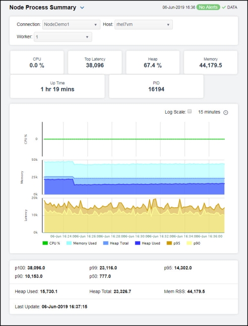 Clicking Node Process Summary in the left/navigation menu opens the Node Process Summary display, which allows you to view the current and historical metrics for a single process. You can view the current information pertaining to a particular process and various request data for the node process in the upper portion of the display. The trend graph in the bottom half of the display contains the current and historical CPU usage percentage, memory usage percentage, heap total, heap used, the number of microseconds that 95 percent of events were late in the previous 4 seconds, and the number of microseconds that 90 percent of events were late in the previous 4 seconds for the node process over a period of time.