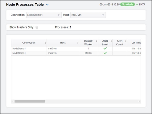 These displays allow you to view the current and historical metrics for all node processes in a heatmap or tabular format for one or all hosts, or view the current and historical metrics for a single node process. Clicking Node Processes from the left/navigation menu opens the Node Processes Table display, which shows a tabular view of data for all node processes for a particular connection/host combination. The following display is available: