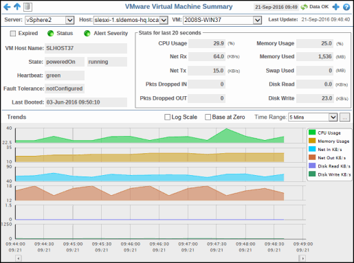 | • | Single VMware VM: Opens the VMware Virtual Machine Summary, which shows current and historical utilization and performance metrics for a single virtual machine. |