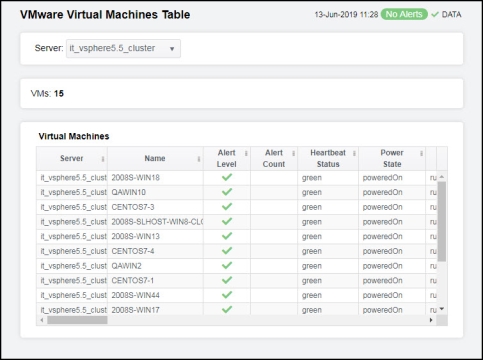 These displays present current and historical data for your virtual machines. Clicking VMware Machines from the left/navigation menu opens the VMware Virtual Machines Table display, which shows all available data for each virtual machine by server. The option available under VMware Machines is: