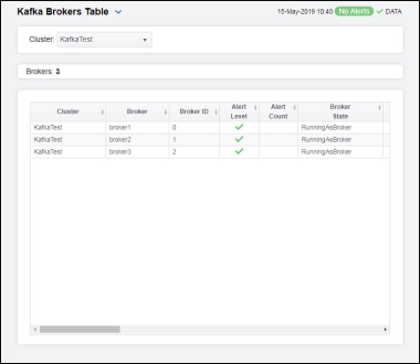 Lists the number of brokers found as a result of the cluster that was selected and displayed in the Kafka Brokers table. |