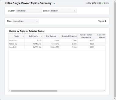 | • | Single Broker Topics Summary: Opens the Kafka Single Broker Topics Summary display, which contains topic data for a single broker. |