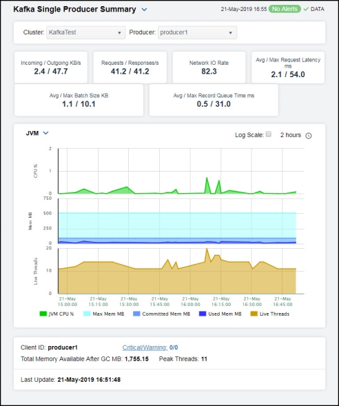 | • | Single Producer Summary: Opens the Kafka Single Producer Summary display, which contains current and historical metrics, as well as trend data, for a single producer. |