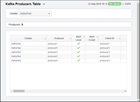Clicking on the information boxes at the top of the display takes you to the Kafka Producers Table display, where you can view additional producers data.