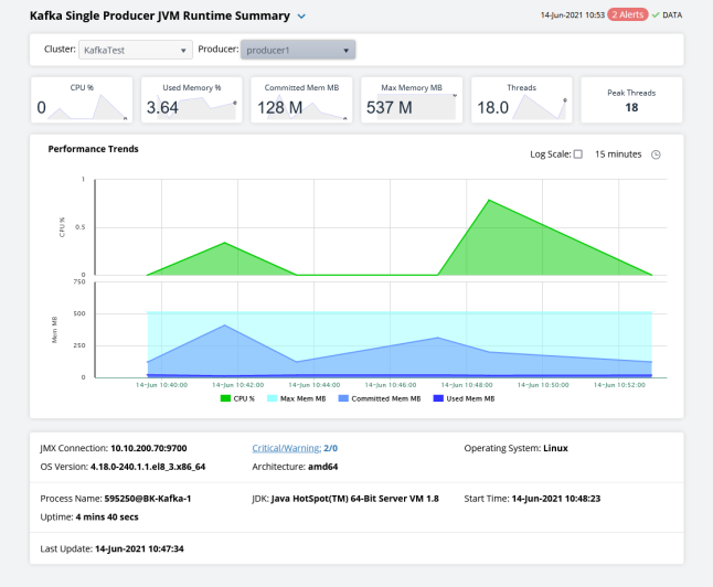 | • | Single Producer JVM Runtime Summary: Opens the Kafka Single Producer JVM Runtime Summary display, which contains current and historical JVM runtime metrics, as well as trend data, for a single producer. |