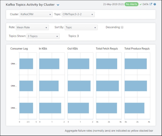 | • | Topics Activity by Cluster: Opens the Kafka Topics Activity by Cluster display, which allows you to view performance metrics for all topics on a particular cluster. |