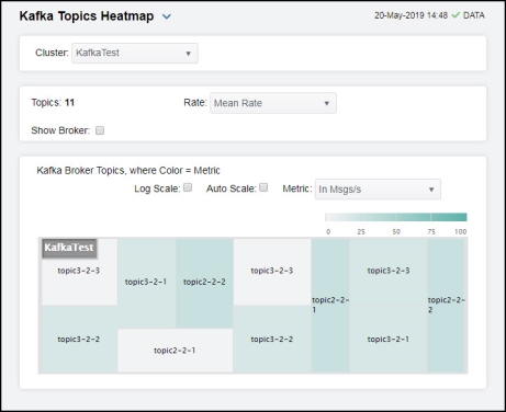 | • | Kafka Topics Heatmap: Opens the Kafka Topics Heatmap display, which allows you to view performance metrics for all servers on a particular cluster. |