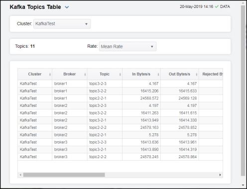 Clicking Topics Activity by Cluster in the left/navigation menu opens the Kafka Topics Activity by Cluster display, which provides a view of the activity metrics on all topics for a particular cluster. You can view the metrics based on the mean rate, a 1 minute average rate, a 5 minute average rate, or a 15 minute average rate.