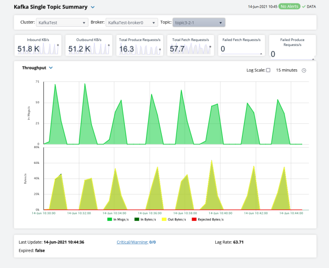 Drill-down and investigate a topic by clicking a rectangle in the heatmap to view details in the Kafka Single Topic Summary display.