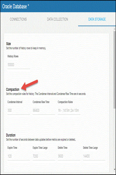 Compaction Rules -- This field defines the rules used to condense your historical data in the database for the following caches: OraInstanceSessionStats, OraInstanceQueryExecStats, and OraDatabaseAvailability. By default, the columns kept in history will be aggregated by averaging rows with the following rule 1h -;1d 5m;2w 15m, which means the data from 1 hour will not be aggregated (1h - rule), the data over a period of 1 day will be aggregated every 5 minutes (1d 5m rule), and the data over a period of 2 weeks old will be aggregated every 15 minutes (2w 15m rule).