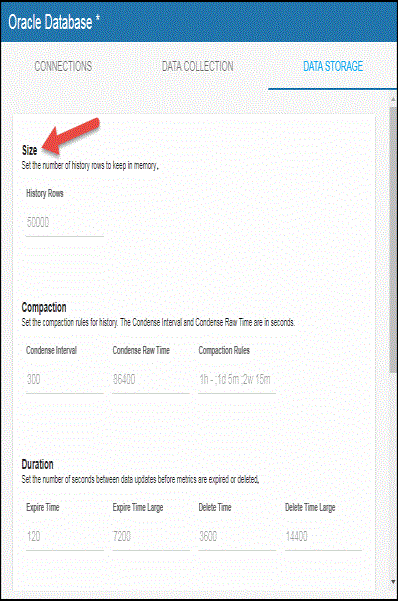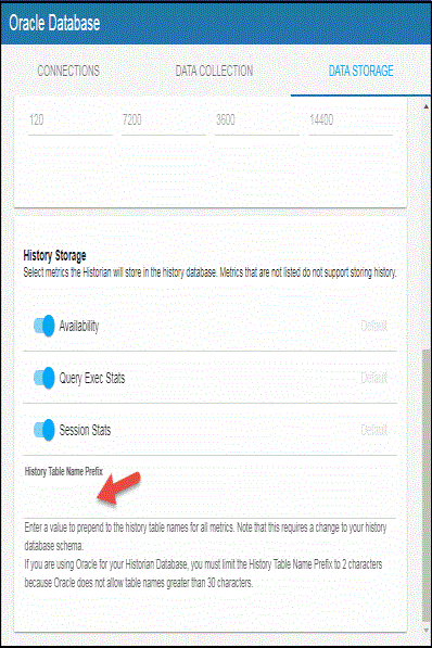 You can modify the maximum number of history rows to store in memory in the DATA STORAGE tab. The History Rows property defines the maximum number of rows to store for the OraInstanceSessionStats, OraDatabaseDiskUsage, OraInstanceQueryExecStats, and OraDatabaseAvailability caches. To update the default settings: