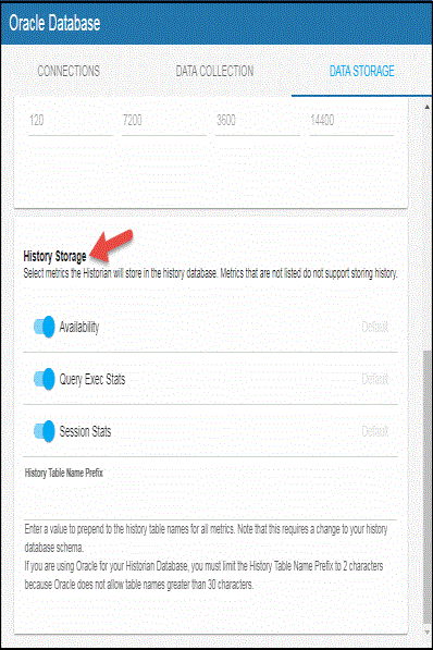 The History Storage section allows you to select which metrics you want the Historian to store in the history database. By default, the following historical data is saved to the database: Availability (OraDatabaseAvailability cache), Query Exec Stats (OraInstanceQueryExecStats cache), and Session Stats (OraInstanceSessionStats cache). The remaining historical data cannot be saved to the historian database. To enable/disable the collection of historical data, perform the following steps: