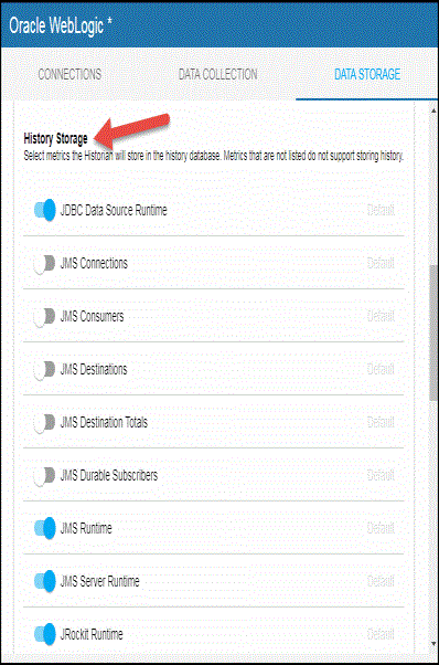 The History Storage section allows you to select which metrics you want the Historian to store in the history database. By default, the following historical data is not saved to the database: JMS Connections (WlsJmsConnection cache), JMS Consumers (WlsJmsConsumer cache), JMS Destinations (WlsJmsDestination cache), JMS Destination Totals (WlsJmsDestinationTotals cache), JMS Durable Subscribers (WlsJmsDurableSubscriber cache), and Session Stats (WlsJmsSessionStats cache). The remaining historical data is saved to the database by default (WlsServerRuntime, WlsServerTotalsByCluster, WlsJRockitRuntime, WlsJvmRuntime, WlsJvmStats, WlsThreadPoolRuntime, WlsJdbcDatasourceRuntime, WlsServletStats, WlsServletTotalsByApp, WlsServletTotalsByServer, WlsServletTotalsByClusterApp, WlsSessionTotalsByServer, WlsSessionTotalsByClusterApp, WLSWorkManagerStats, WLSWorkManagerTotalsByServer, WLSWorkManagerTotalsByApp, WlsJmsRuntime, and WlsJmsServerRuntime caches). To enable/disable the collection of historical data, perform the following steps: