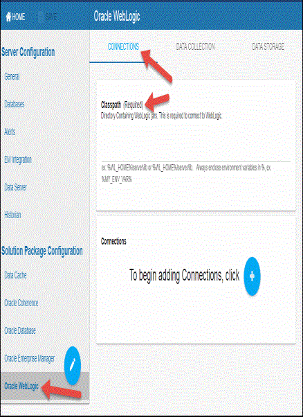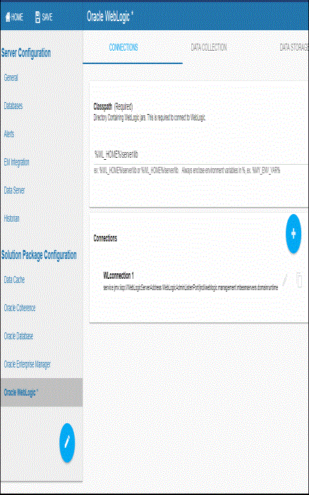 - Navigate to the Solution Package Configuration > Oracle WebLogic > CONNECTIONS tab.
