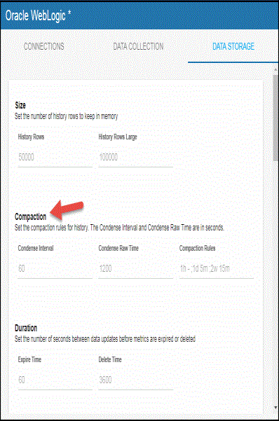 Compaction Rules -- This field defines the rules used to condense your historical data in the database for the following caches: WlsJrockitRuntime, WlsServerRuntime, WlsThreadPoolRuntime, WlsJdbcDatasourceRuntime, WlsJvmRuntime, WlsJvmStats, WlsServerTotalsByCluster, WlsServletStats, WlsServletTotalsByServer, WlsServletTotalsByApp, WlsSessionStats, WlsSessionTotalsByServer, WlsSessionTotalsByClusterApp, WlsServletTotalsByClusterApp, WlsWorkManagerStats, WlsWorkManagerTotalsByApp, and WlsWorkManagerTotalsByServer. By default, the columns kept in history will be aggregated by averaging rows with the following rule 1h -;1d 5m;2w 15m, which means the data from 1 hour will not be aggregated (1h - rule), the data over a period of 1 day will be aggregated every 5 minutes (1d 5m rule), and the data over a period of 2 weeks old will be aggregated every 15 minutes (2w 15m rule).