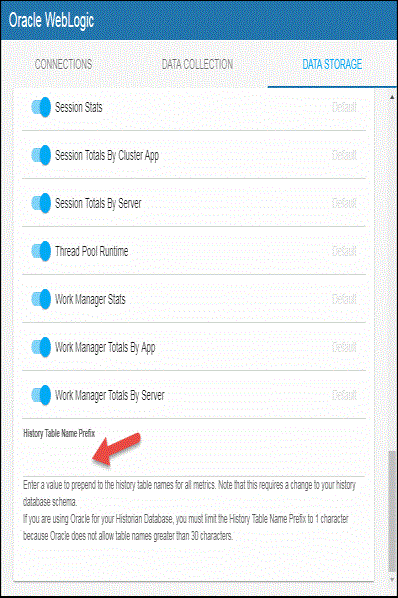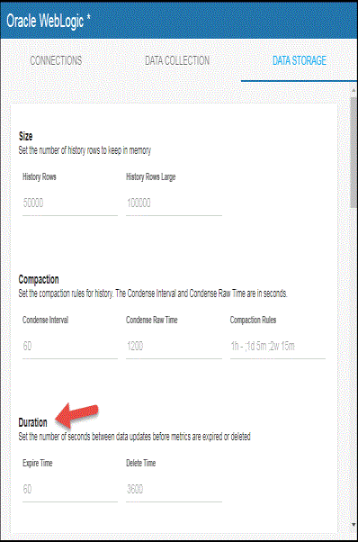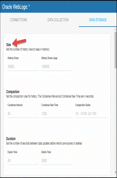 You can modify the maximum number of history rows to store in memory in the DATA STORAGE tab. The History Rows property defines the maximum number of rows to store for the WlsJmsPersistentStoreRuntime, WlsJmsPersistentStoreConnectionRuntime, WlsJmsConnection, WlsJmsProducer, WlsJmsConsumer, WlsJmsDurableSubscriber, WlsJmsPooledConnectionRuntime, WlsJmsRuntime, WlsJmsServerRuntime, WlsJrockitRuntime, WlsServerRuntime, WlsThreadPoolRuntime, WlsJdbcDatasourceRuntime, WlsJvmRuntime, WlsJvmStats, WlsServerTotalsByCluster, WlsServletStats, WlsServletTotalsByServer, WlsServletTotalsByApp, WlsSessionStats, WlsSessionTotalsByServer, WlsSessionTotalsByClusterApp, WlsServletTotalsByClusterApp, WlsWorkManagerStats, WlsWorkManagerTotalsByApp, and WlsWorkManagerTotalsByServer caches. The default setting for History Rows is 50,000. The History Rows Large property defines the maximum number of rows to store for the WlsJmsDestinationTotals and WlsJmsDestination caches. The default setting for History Rows Large is 100,000. To update the default settings:
