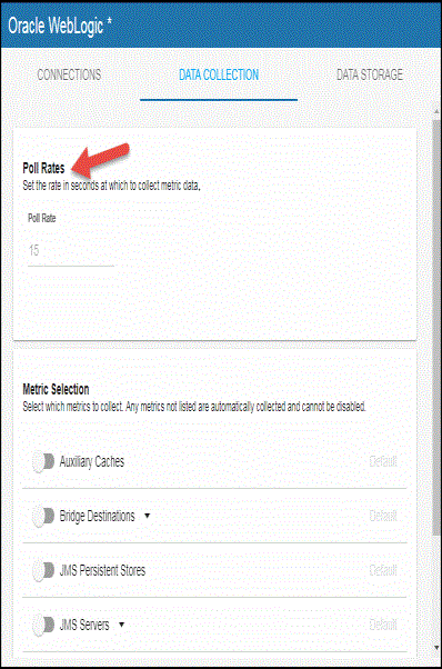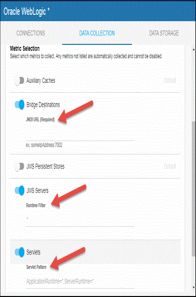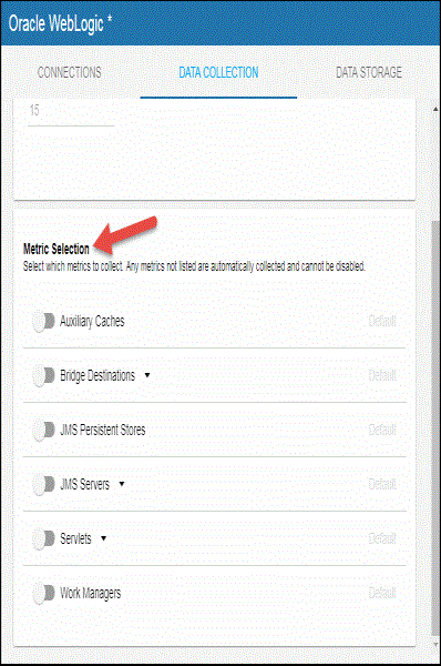 - By default, collecting auxiliary caches, bridge destinations, JMS persistent stores, JMS servers, servlets, and work managers data is disabled. To enable collecting this data, navigate to the Solution Package Configuration > Oracle WebLogic > DATA COLLECTION tab > Metric Selection section and enable the metrics for which you want to collect data.