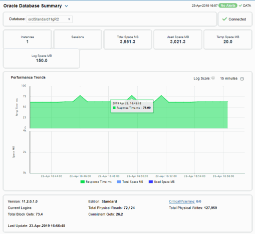 Investigate and compare detailed utilization metrics for all Oracle databases. This display contains all metrics available for Oracle databases, including Space Used, Free Space, Total Space and the number of Instances on each.
