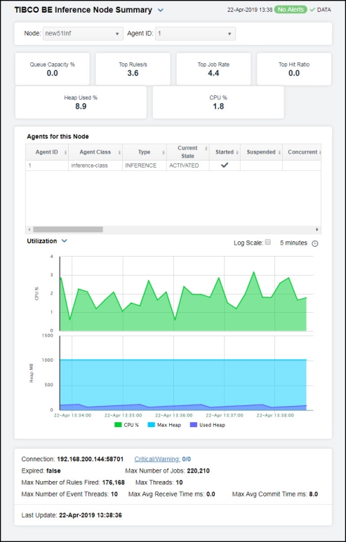 Clicking Inference Node Summary in the left/navigation menu opens the TIBCO BE Inference Node Summary display, which allows you to view configuration and utilization data for a single inference node. View a list of all agents on the node and trend graphs tracing the rule execution rate for agents on the node. The rule execution rate is relative to the overall CPU and heap utilization for the engine's JVM.
