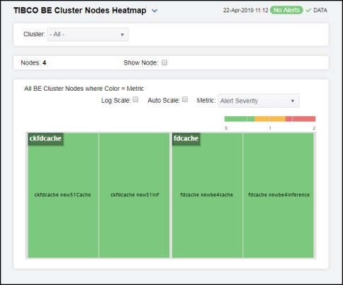 | • | Cluster Nodes Heatmap: Opens the TIBCO BE Cluster Nodes Heatmap , which shows cluster and alert status for all BE cluster nodes. |