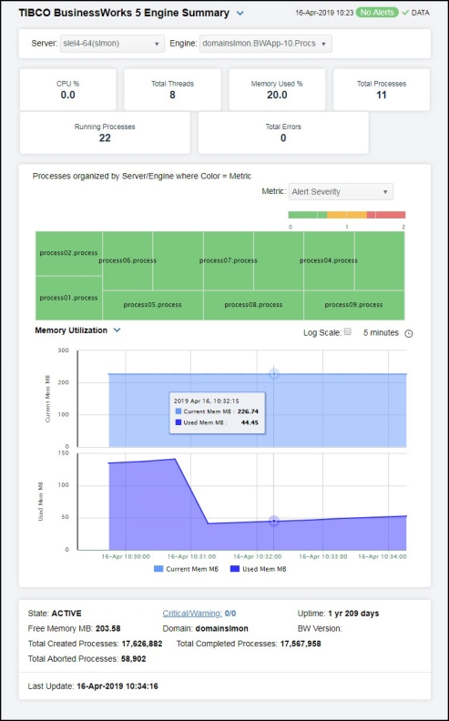 Clicking BW5 Engine Summary in the left/navigation menu opens the TIBCO BusinessWorks 5 Engine Summary display, which allows you to track utilization and performance metrics for specific BW5 engines and their associated processes. Clicking on the information boxes at the top of the display takes you to the TIBCO BusinessWorks 5 Engines Table display or to the TIBCO BusinessWorks 5 Processes Table display (depending on which box you select), where you can view additional data on engines and processes. In the Processes organized by Server/Engine heatmap, you can select from the available metrics to view the current status of the processes running on the selected engine. Available metrics include Alert Severity, Alert Count, Created Processes, Completed Processes, and Average Execution.