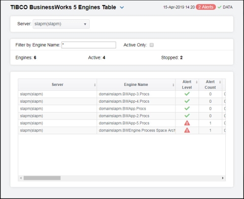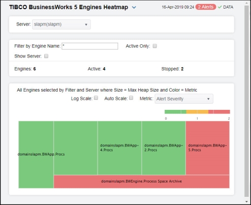 | • | All Engines Heatmap: Opens the TIBCO BusinessWorks 5 Engines Heatmap , which shows engine and alert status for all BW5 servers. |