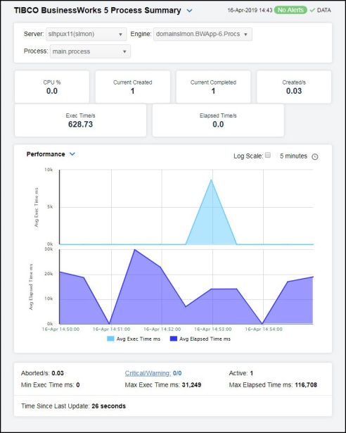 | • | BW5 Process Summary: Opens the TIBCO BusinessWorks 5 Process Summary display, which shows historical and current metrics for a single process, including average execution times and execution counts. |