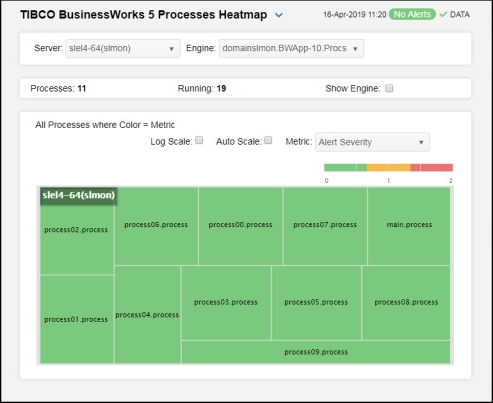 Clicking All Processes Heatmap in the left/navigation menu opens the TIBCO BW5 Processes Heatmap, which allows you to view the status and alerts of all BW5 processes for all engines or for a specific engine. Use the Metric drop-down menu to view processes in the heatmap by the Alert Severity, Alert Count, CPU Used Percentage, Completed Processes, Active Processes, Aborted Processes, Suspended Processes, Execution Time per second, Created per second, Aborted per second, Suspended per second, Most Recent Execution Time, Average Execution Time, Most Recent Elapsed Time, and Average Elapsed Time.