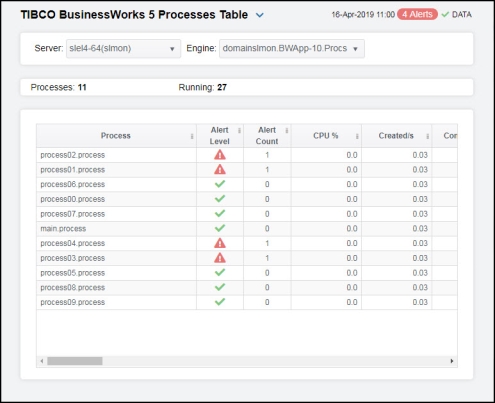 Select a server and engine from the drop-down menus. Each row in the table is a different process. The table displays all metrics available from the Hawk microagent for a process. (Refer to documentation for TIBCO BusinessWorks Administration, see Appendix A: TIBCO Hawk Microagent Methods).