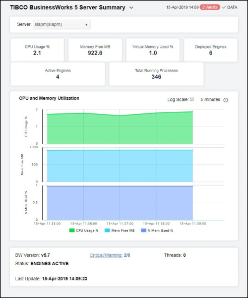 Clicking BW5 Server Summary in the left/navigation menu opens the TIBCO BusinessWorks 5 Server Summary display, which allows you to track utilization and performance metrics for specific BW5 servers. Clicking on the information boxes at the top of the display takes you to the TIBCO BusinessWorks 5 Servers Table display, the TIBCO BusinessWorks 5 Engines Table display, or the TIBCO BusinessWorks 5 Processes Table display (depending on which box you select), where you can view additional servers data. In the CPU and Memory Utilization trend graph region, you can view CPU usage percentage, free memory, and virtual memory used percentage over a selected time range. Clicking the Critical/Warning link at the bottom of the display opens the Alerts Table by Component display.