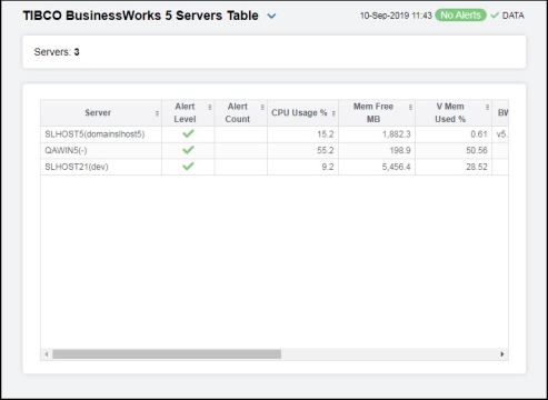 Investigate detailed utilization metrics for all BW servers. The TIBCO BusinessWorks 5 Servers Table contains all metrics available for servers, including CPU usage percentage, free memory, and percentage of virtual memory used. Each row in the table contains data for a particular server. Click a column header to sort column data in ascending or descending order. Double-click on a table row to drill-down to the TIBCO BusinessWorks 5 Server Summary display and view metrics for that particular server. Toggle between the commonly accessed Table and Heatmap displays by clicking the drop down list on the display title.