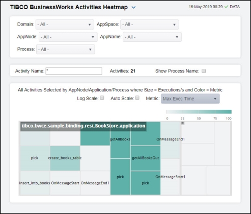 | • | BW Activities Heatmap: Opens the TIBCO BusinessWorks Activities Heatmap , which shows process execution metrics for all activities. |