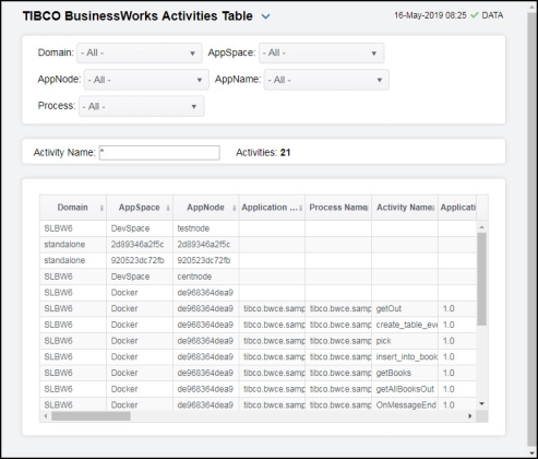 Select a domain, AppSpace, AppNode, AppName, and process from the drop-down menus. Each row in the table is a different activity and contains all metrics available for the activity.