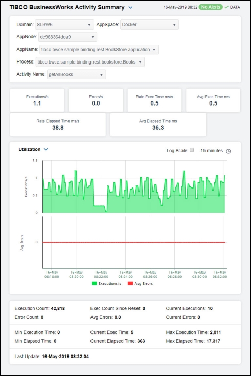 Clicking BW Activity in the left/navigation menu opens the TIBCO BusinessWorks Activity Summary display, which allows you to view current and historical execution metrics for a single BusinessWorks activity. Choose a domain, AppSpace, AppNode, Application Name, Process, and Activity from the drop-down menus.