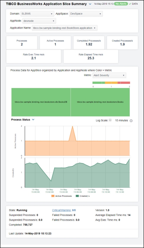 In the Process Data for AppNode organized by Application heatmap, you can select from the available metrics to view the current status of the processes running on the selected AppNode. Available metrics include Alert Severity, Alert Count, Created/s, and Average Execution. Drill-down and investigate by clicking a AppSlice in the heatmap to view details in the TIBCO BusinessWorks Application Slice Summary display.