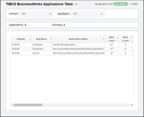 Investigate detailed utilization metrics for all BW applications. The TIBCO BusinessWorks Applications Table contains all metrics available for applications, including the number of active, failed, suspended, and created applications. Each row in the table contains data for a particular application. Choose a Domain and AppSpace from the drop-down menus to display activities for the selected Domain/AppSpace combination, or choose All from the drop downs to view all applications. Click a column header to sort column data in ascending or descending order. Double-click on a table row to drill-down to the TIBCO BusinessWorks Application Summary display and view metrics for that particular application. Toggle between the commonly accessed Table and Heatmap displays by clicking the drop down list on the display title.