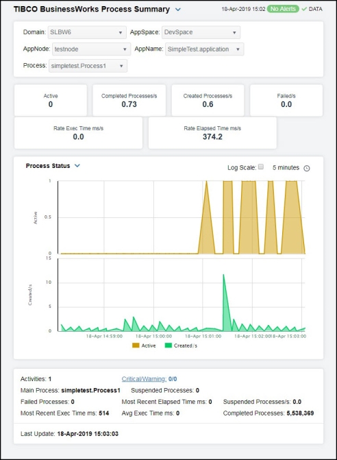 Clicking BW Process in the left/navigation menu opens the TIBCO BusinessWorks Process Summary display, which allows you to view current and historical execution metrics for a single BusinessWorks process. Choose a domain, AppSpace, AppNode, Application Name, and Process from the drop-down menus.