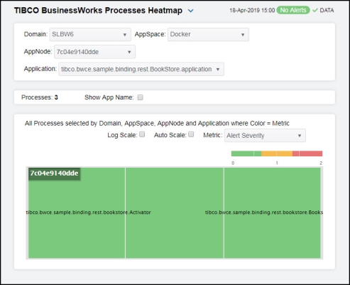 | • | BW Processes Heatmap: Opens the TIBCO BusinessWorks Processes Heatmap , which shows process execution metrics for all processes. |