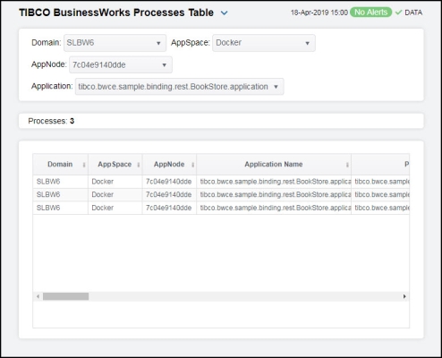 Clicking on the information boxes at the top of the display takes you to the TIBCO BusinessWorks Processes Table display, where you can view additional process data.