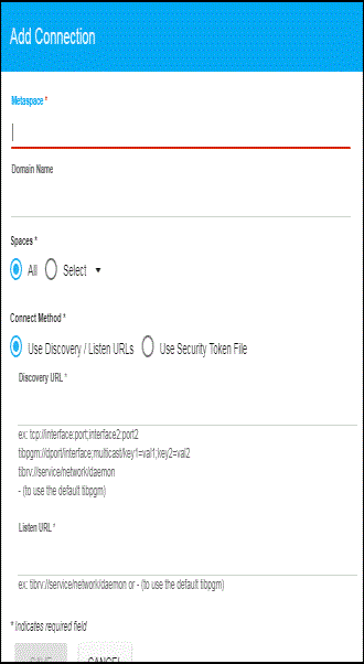 - Enter the metaspace name, the domain name(s), connection name(s), and space name(s) to which you want to view data and click Save to connect to your metaspace, where:
