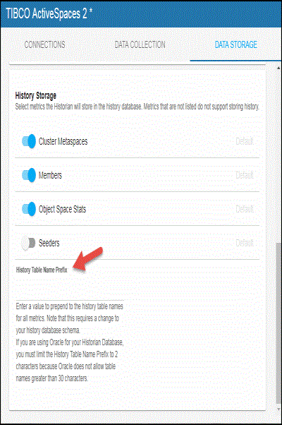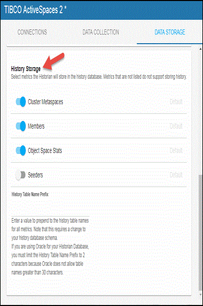 The History Storage section allows you to select which metrics you want the Historian to store in the history database. By default, historical Cluster Metaspaces (TasMetaspaces cache), Members (TasMembers cache), and Object Space Stats (TasSpaceStatistics cache) are saved to the database. Seeders (TasSeeders cache) data is not saved by default. To enable/disable the collection of this historical data, perform the following steps: