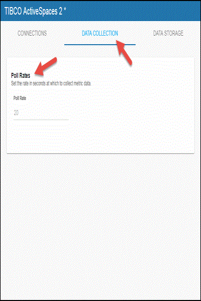 - Optionally, you can specify the Poll Rates (query interval, in seconds) that will be used to collect the metric data for all caches by clicking on the DATA COLLECTION tab and entering the desired polling rate. The caches impacted by this field are: TasQueryStats, TasSpaceStatistics, TasMemberStatistics, TasMembers, TasMetaspaces, and TasSeeders.