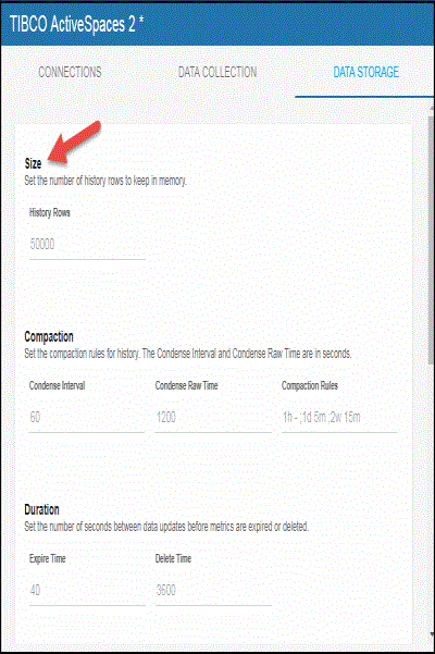 - Navigate to Solution Package Configuration>TIBCO Active Spaces>DATA STORAGE tab.